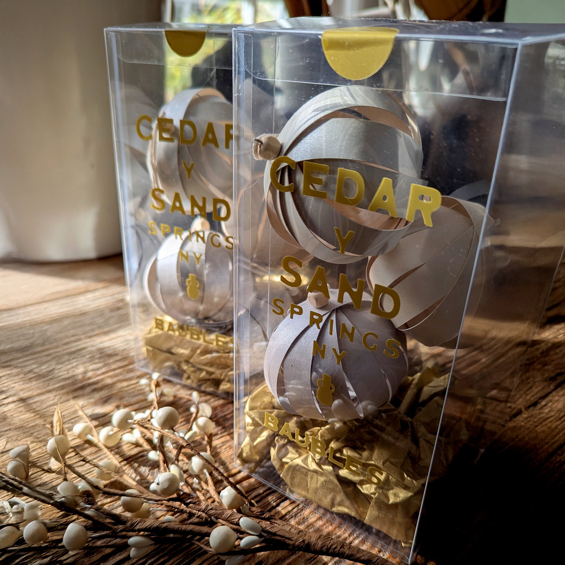Each set arrives nested in a clear display box with gold CEDAR Y SAND lettering and metallic tissue—ready for gifting, and perfectly suited for storing your ornaments once the season has passed. A small sculptural statement for the holiday home, thoughtfully finished and made to last.