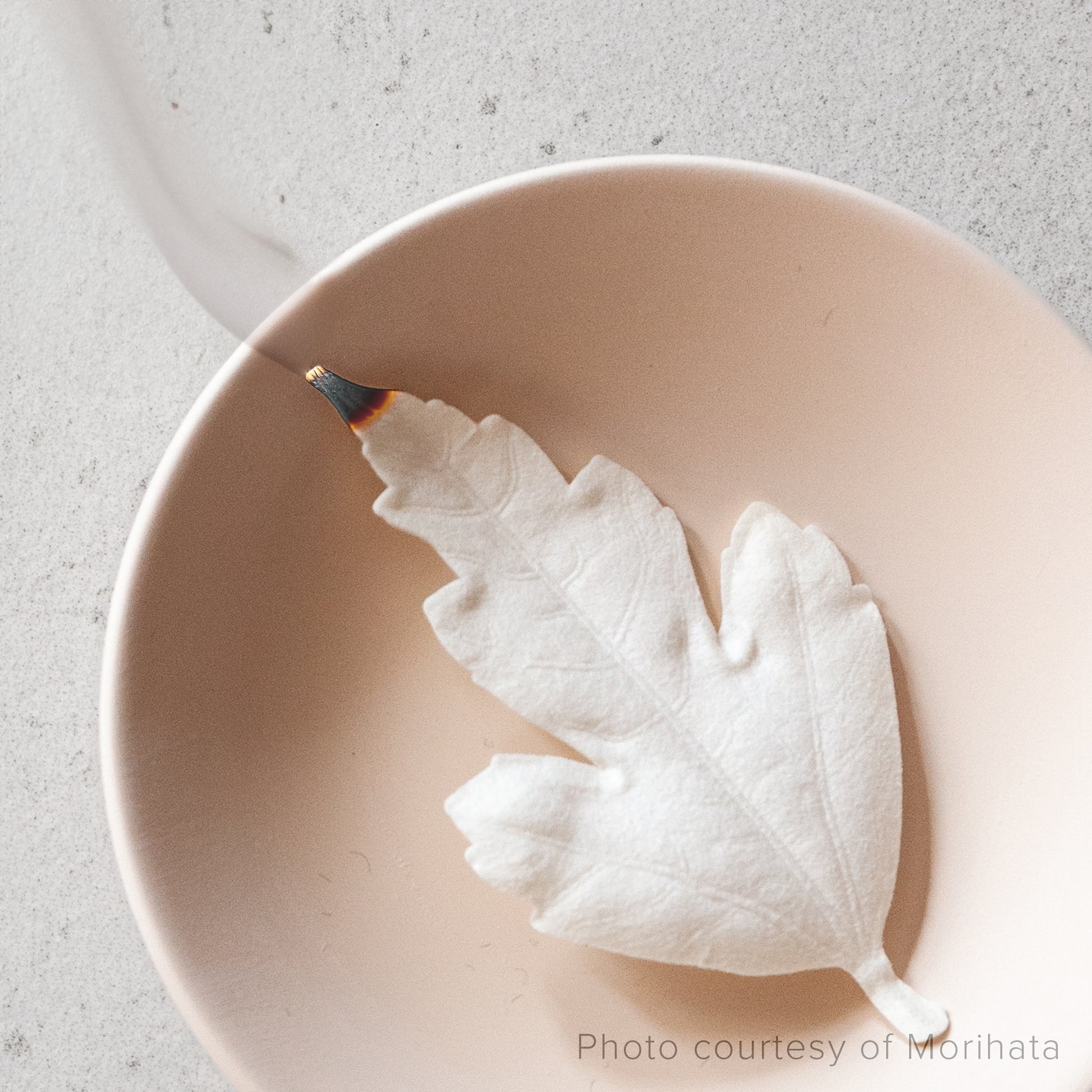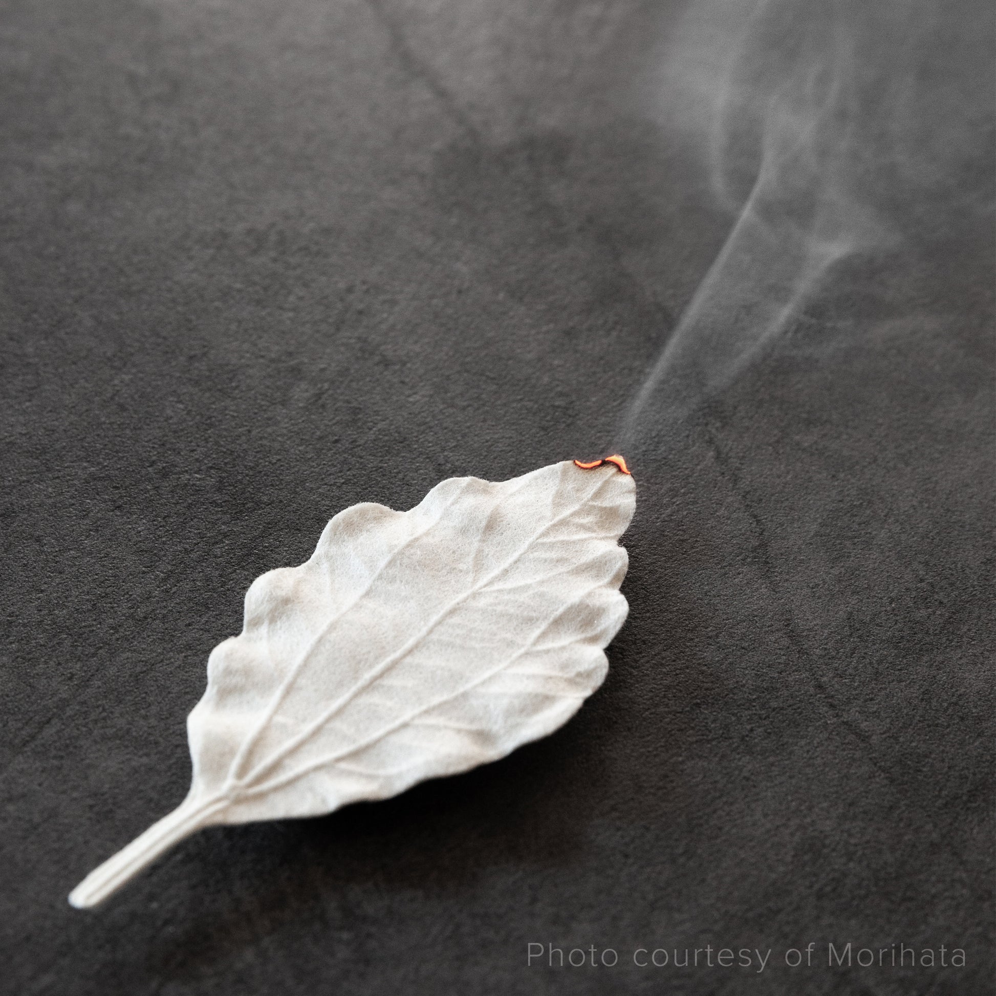 Light the tip of a leaf and blow out the flame. Place the smoldering leaf on the included felt burner mat, ensuring it rests on a non-flammable surface, such as the provided burning dish. Each leaf will burn for about 5-7 minutes.